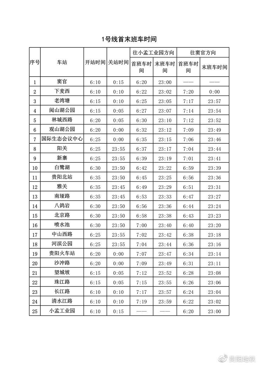 因1号线(增加窦官至下麦西一站一区间)即将开通初期运营,自2019年12月28日起,我司将对贵阳轨道交通1号线首、末班车时间进行调整,给您的出行带来不便,敬请谅解。