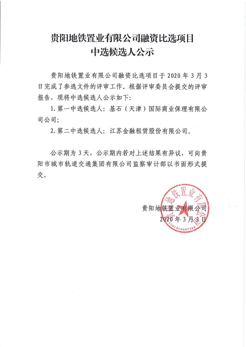 贵阳地铁置业有限公司融资比选项目中选候选人公示