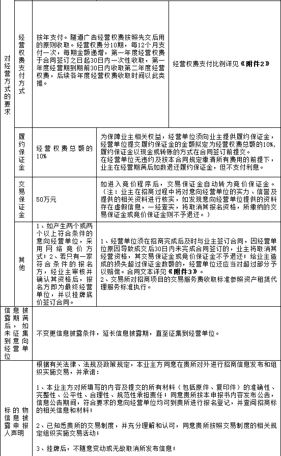 本招商标的为贵阳轨道交通1号线36个隧道区间隧道广告经营权。隧道广告媒体设施由经营单位负责建设,在实施过程中不能对隧道、车站、列车内的现有设施造成不良影响,不能对运营安全及管理造成影响,业主方对经营单位的实施管理要求详见合同范本。经营单位在经营期内负责贵阳轨道交通1号线隧道广告的经营,包括对隧道广告设施的建设、推广、营销、运营、管理、维护、发布广告获取收入,并在经营期结束后,按合同约定对隧道广告设施进行处置。