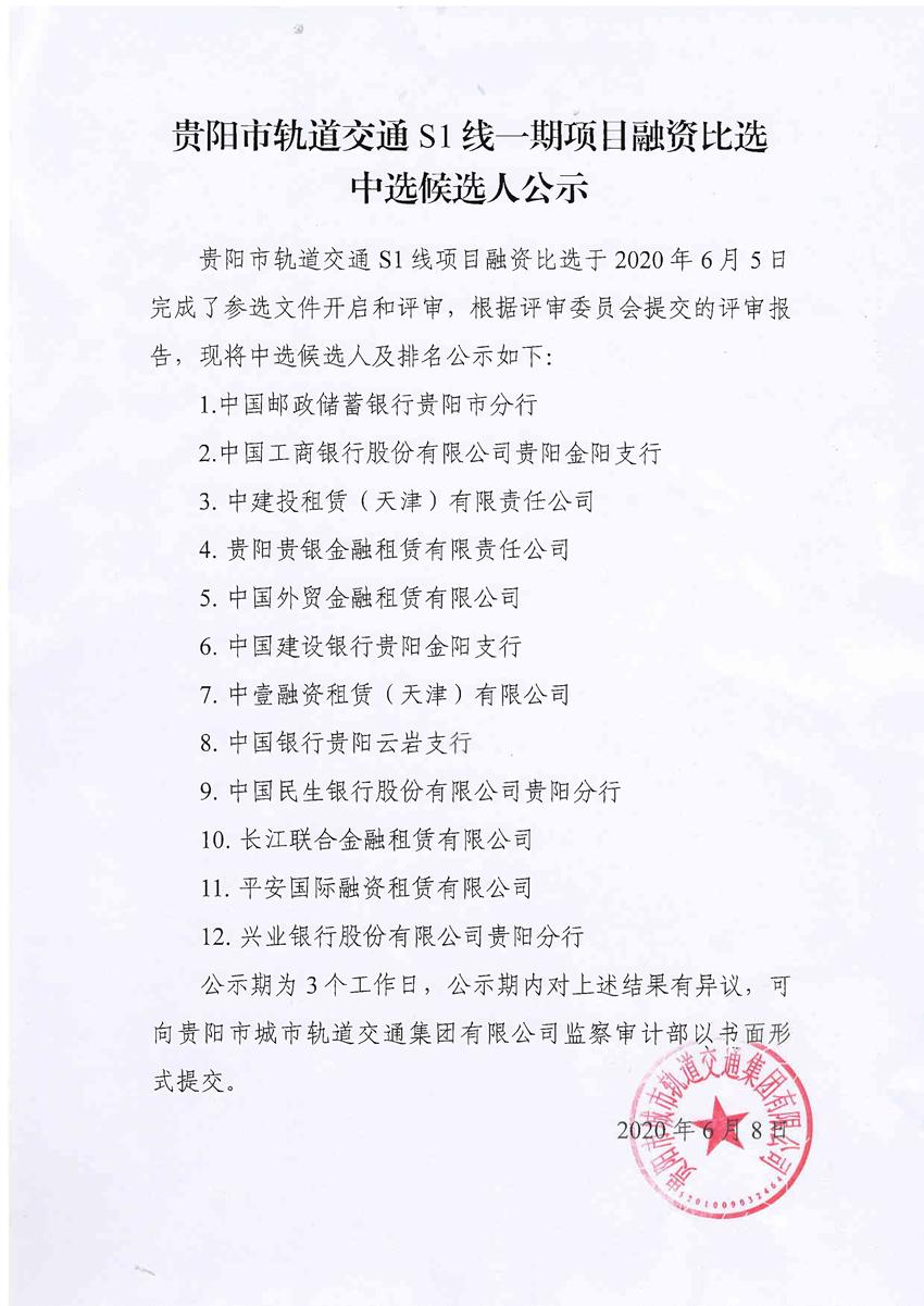贵阳市轨道交通S1线一期项目融资比选中选候选人公示