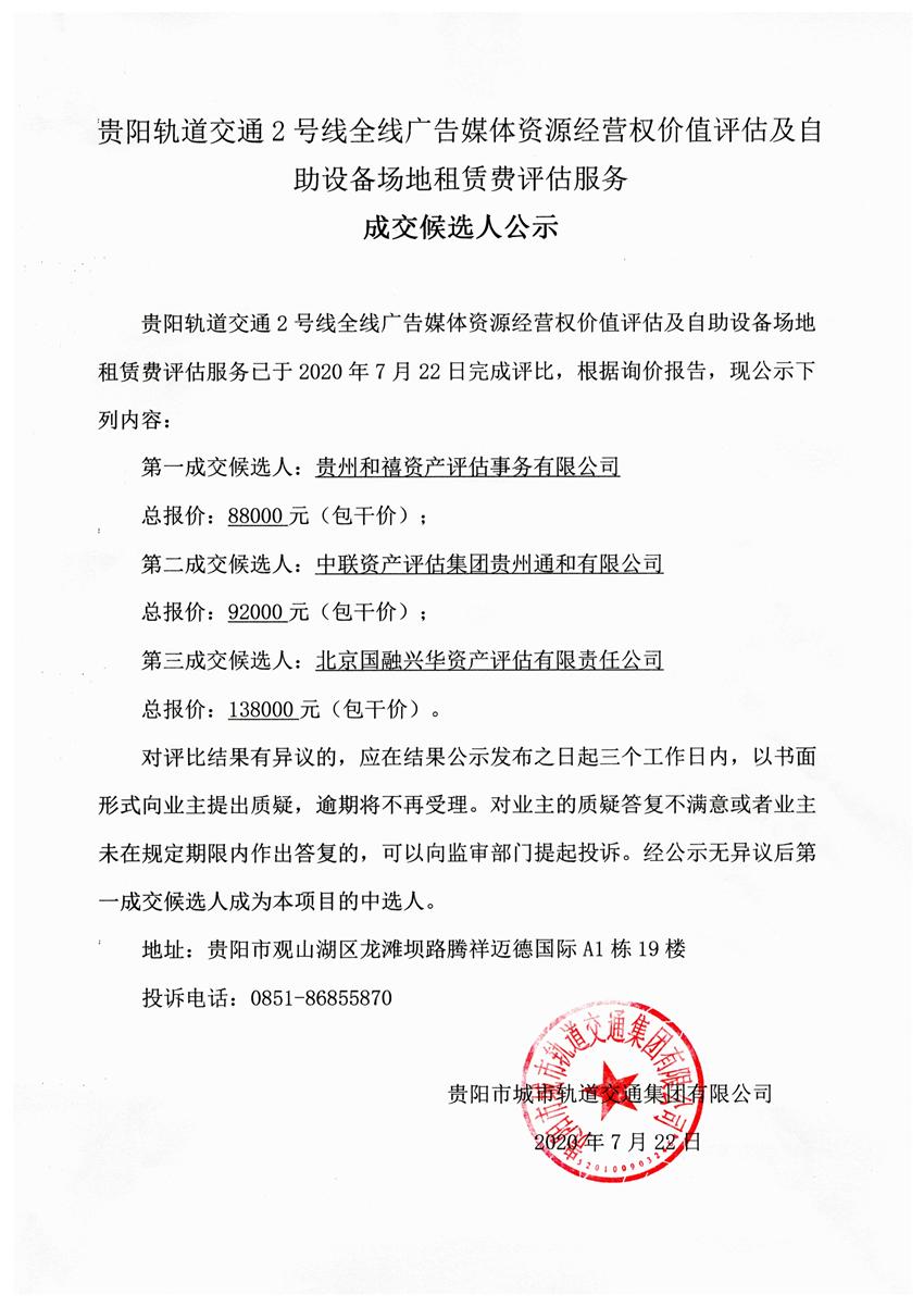 《贵阳轨道交通2号线全线广告媒体资源经营权价值评估及自助设备场地租赁费评估服务成交候选人公示》