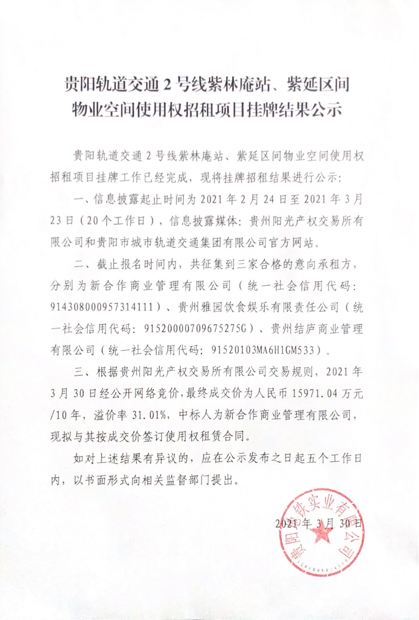 贵阳轨道交通2号线紫林庵站、紫延区间物业空间使用权招租项目挂牌结果公示