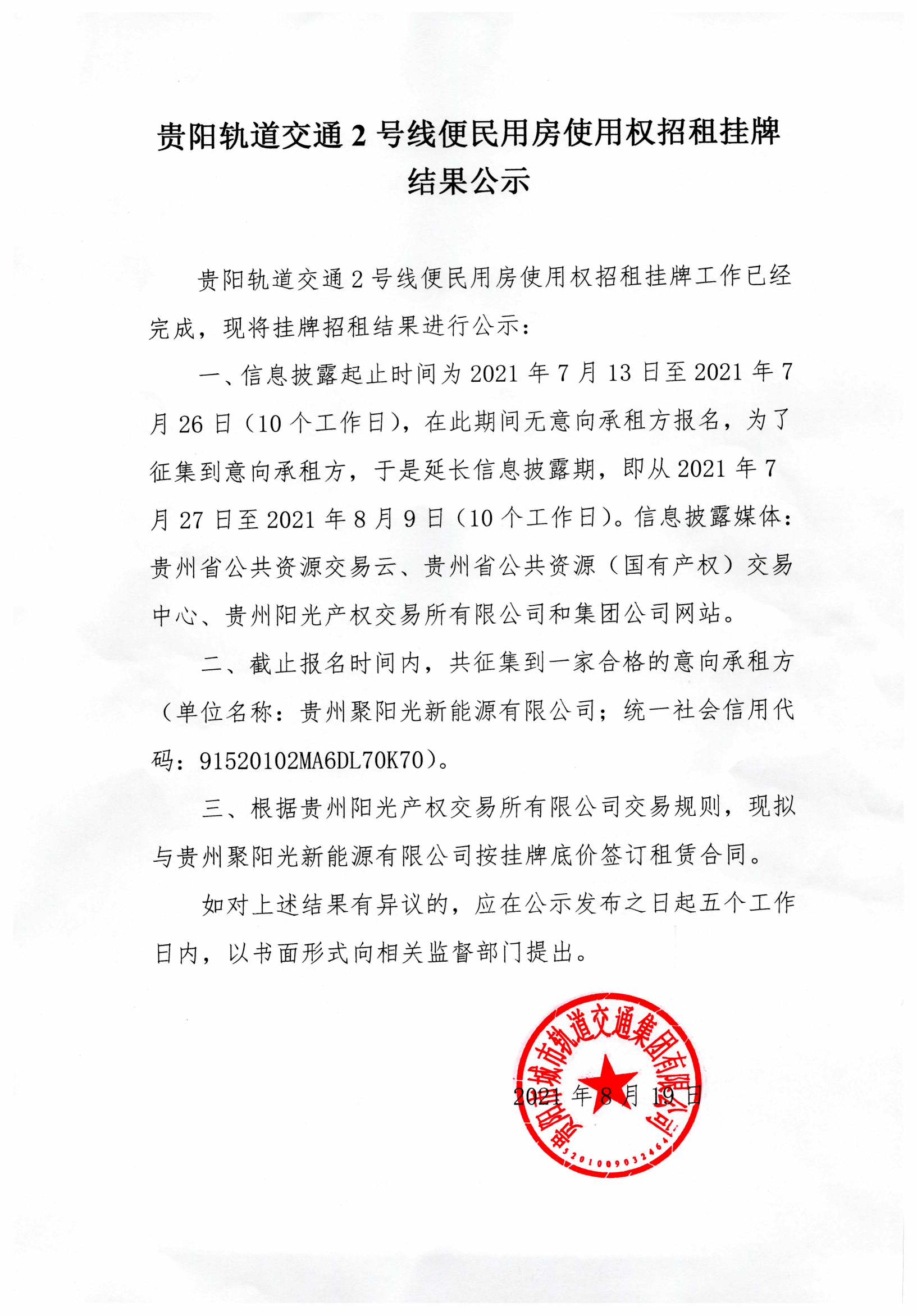 贵阳轨道交通2号线便民用房使用权招租挂牌结果公示