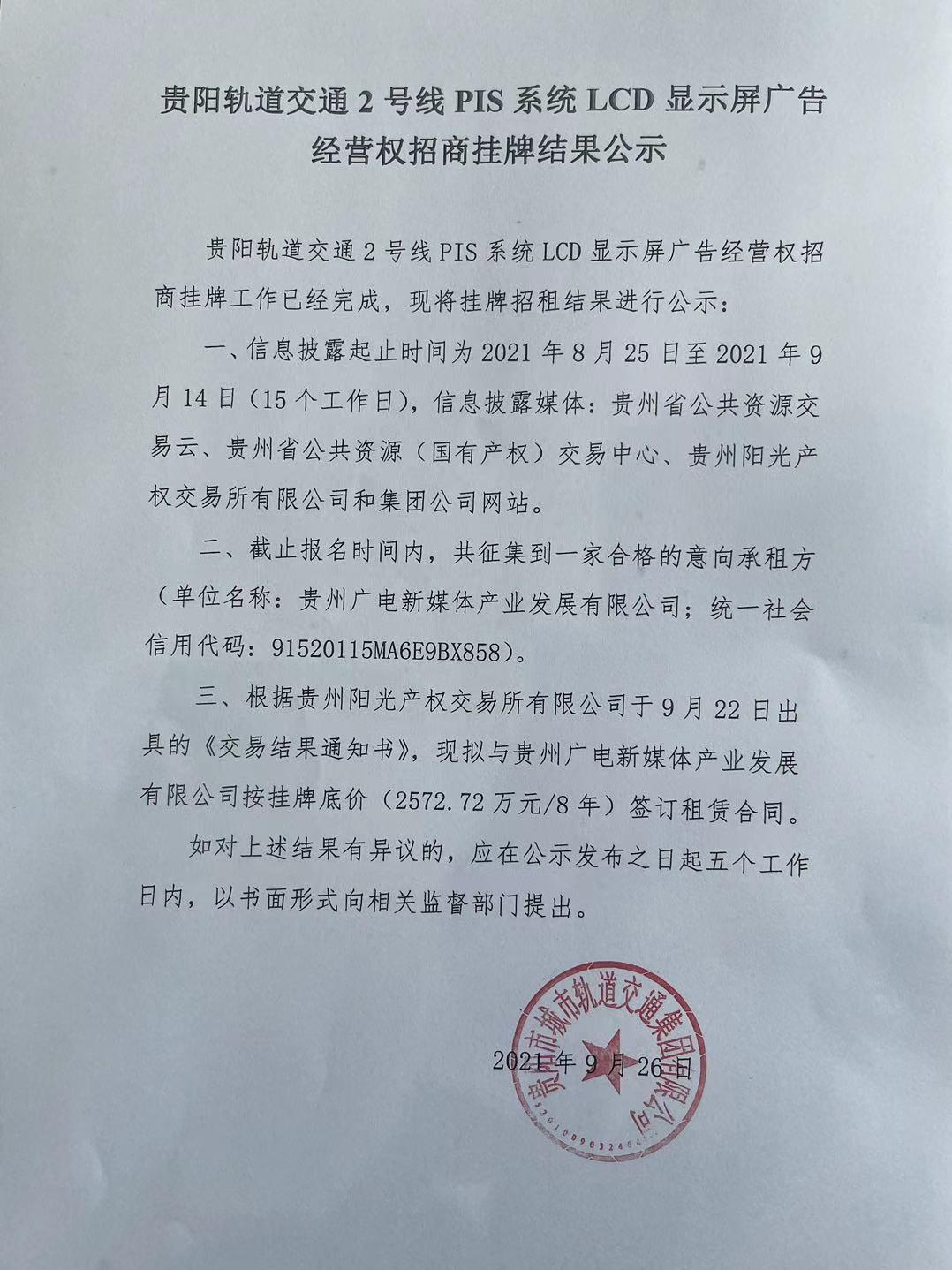 贵阳轨道交通2号线PIS系统LCD显示屏广告经营权招商挂牌结果公示