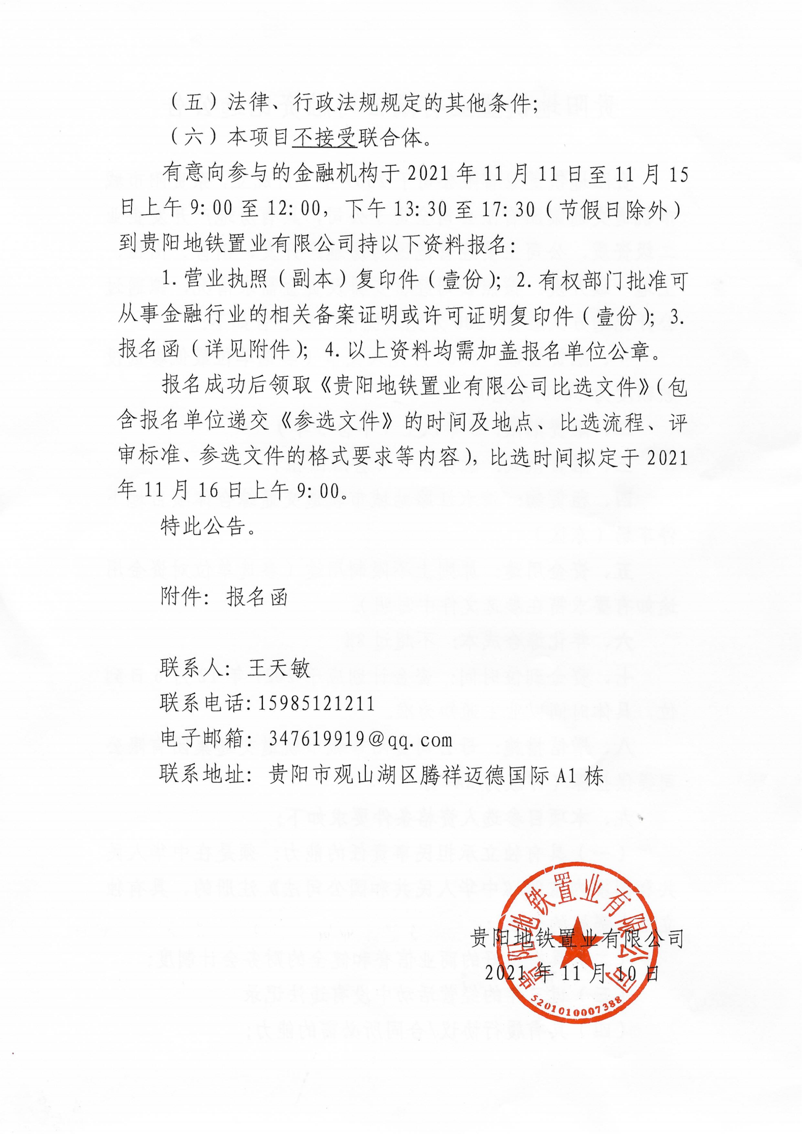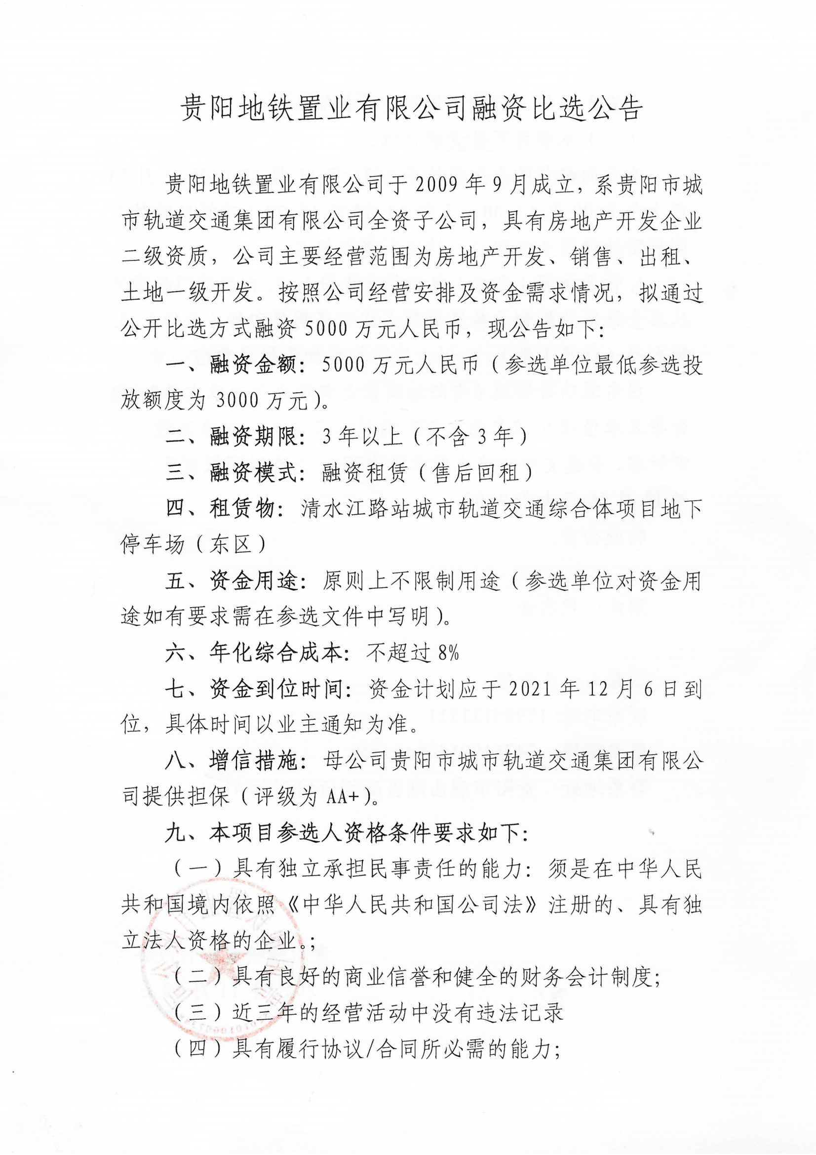 贵阳地铁置业有限公司融资比选公告