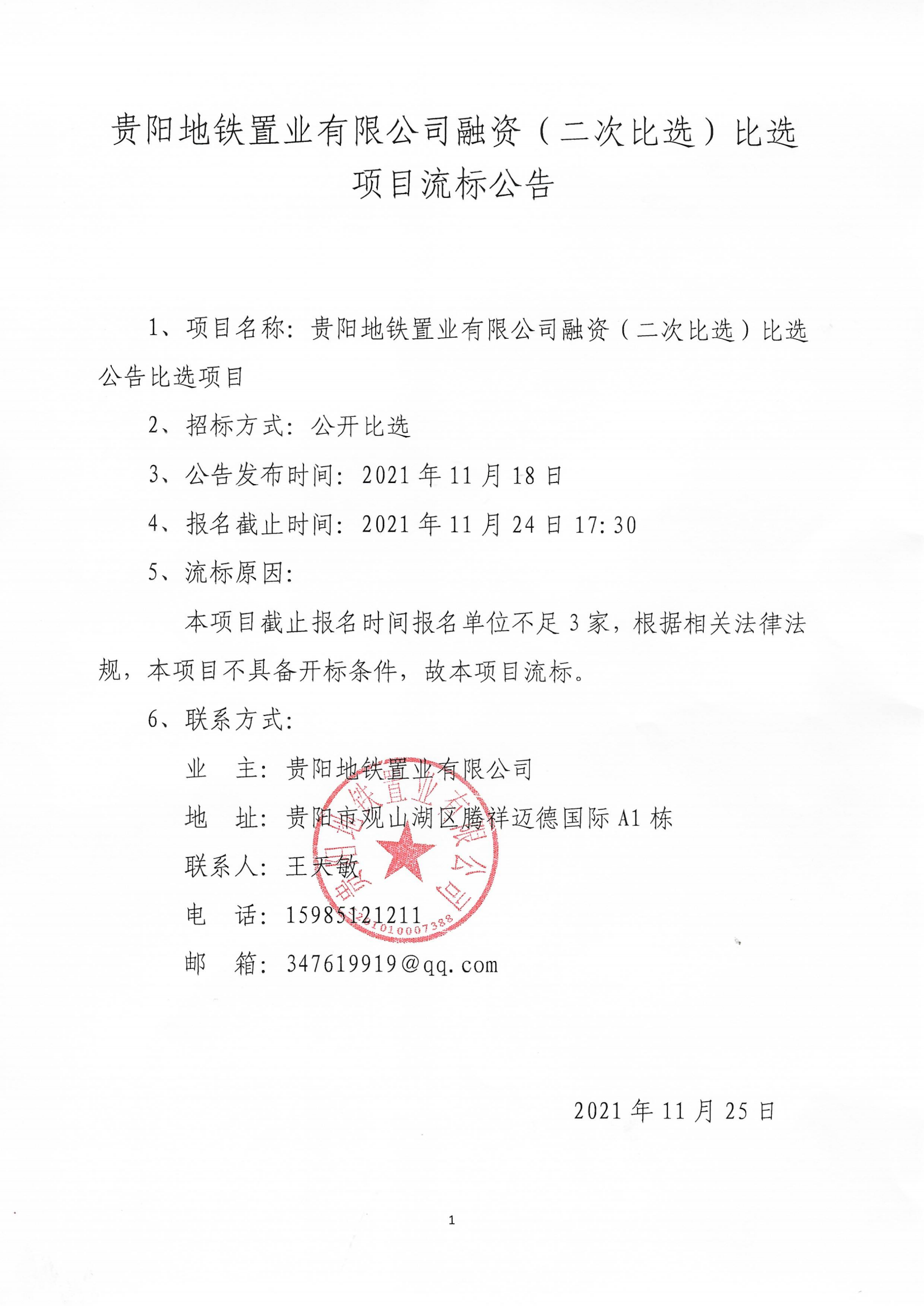 贵阳地铁置业有限公司融资(二次比选)比选项目流标公告
