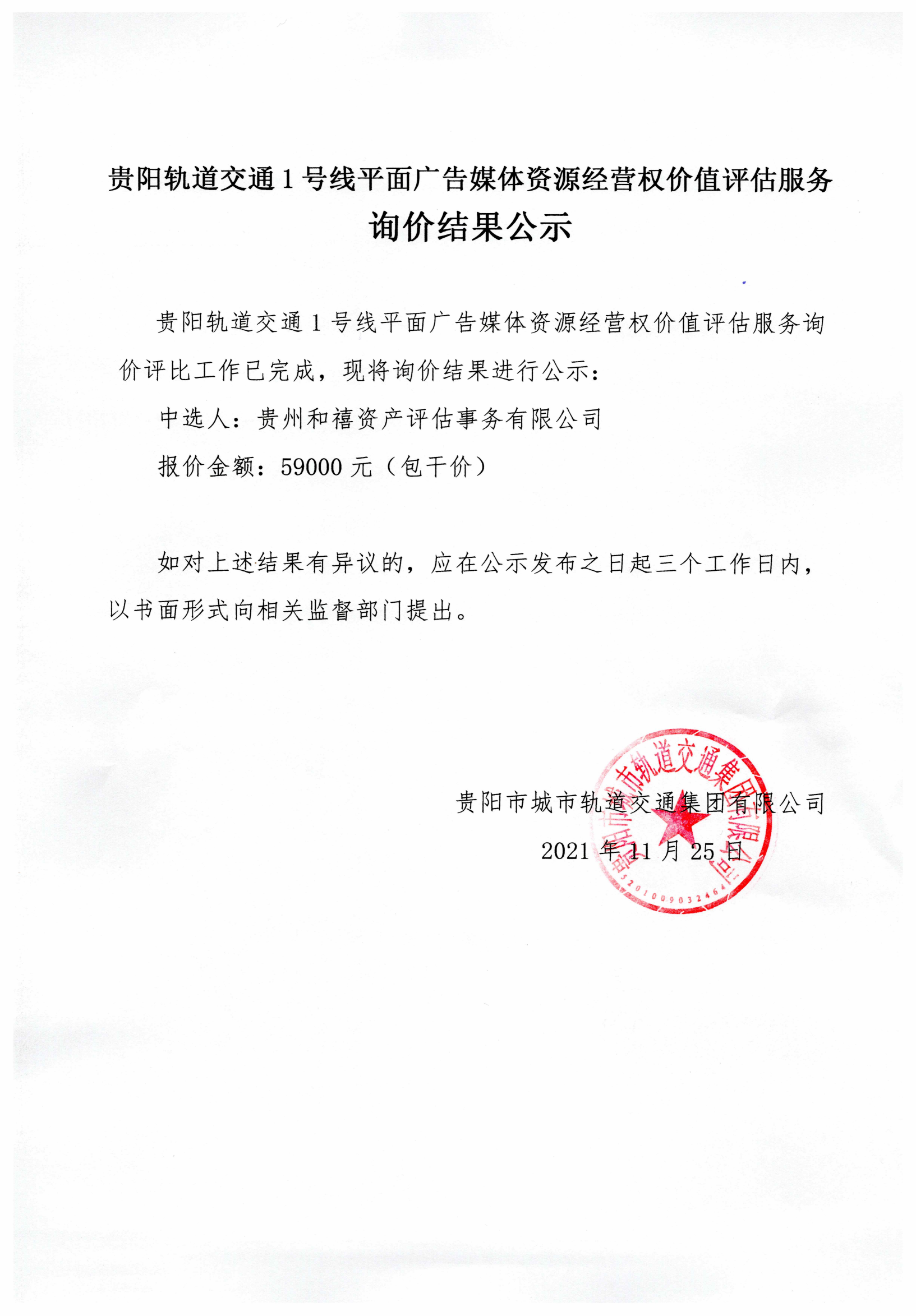 贵阳轨道交通1号线平面广告媒体资源经营权价值评估服务询价结果公示