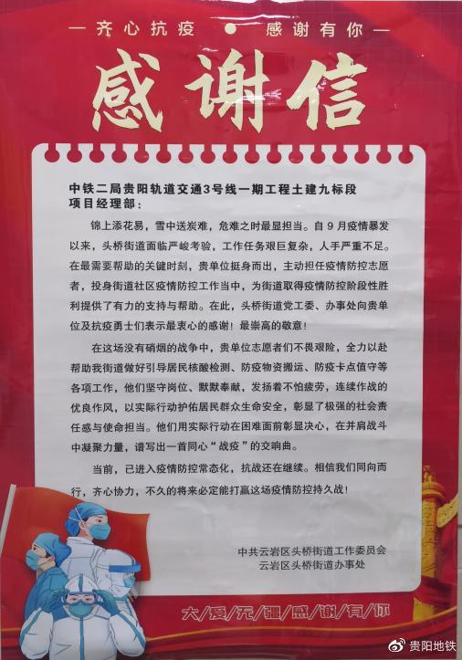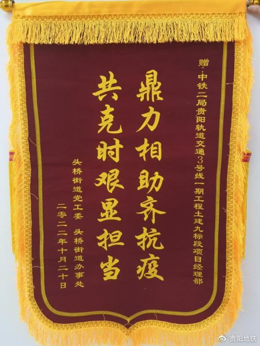 10月24日,轨道交通3号线土建9标项目部收到云岩区头桥街道办送来的一面写着“鼎力相助齐抗疫 共克时艰显担当”的锦旗和感谢信,感谢项目部在疫情防控工作中挺身而出、主动担当。