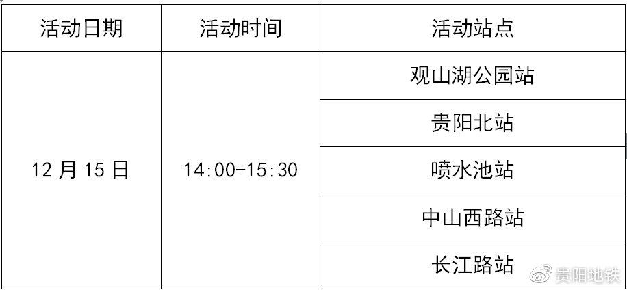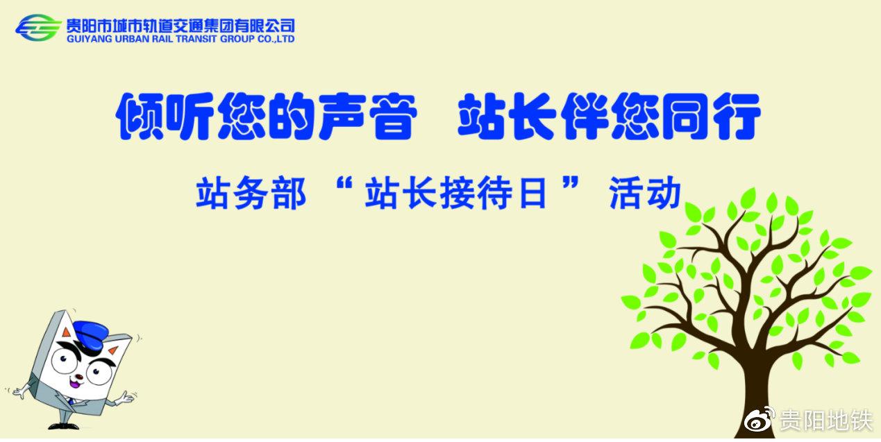 为进一步了解地铁日常运营中存在的问题,关注市民的实际出行需求,贵阳地铁将于12月15日(本周日)在1号线的五个站点开展以“倾听您的声音,站长伴您同行”为主题的站长接待日活动。届时,欢迎乘客来到车站向站长们提出对贵阳地铁的宝贵意见,同时在搭乘地铁过程中如有疑问与不解,站长们将现场为乘客答疑解惑。