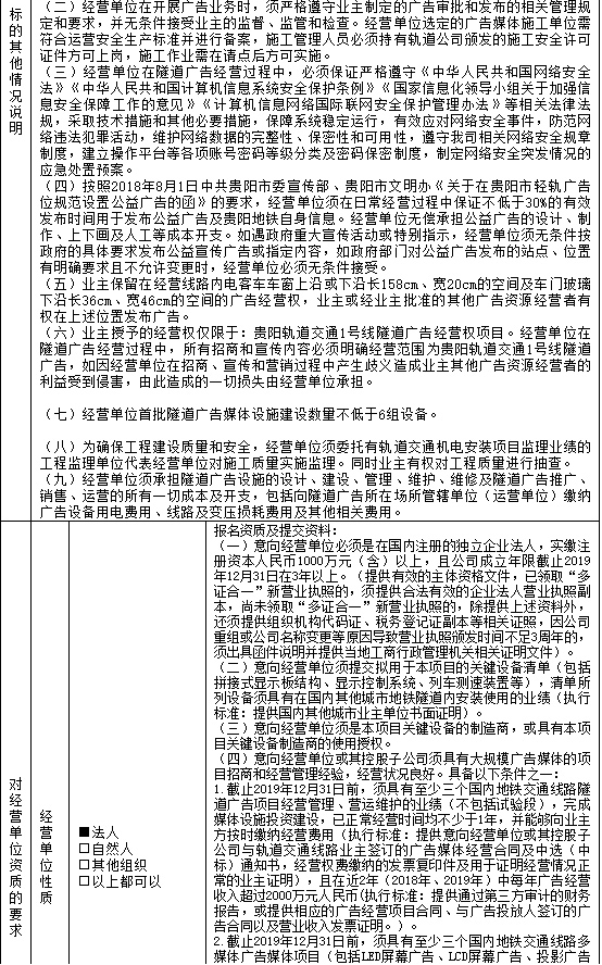 本招商标的为贵阳轨道交通1号线36个隧道区间隧道广告经营权。隧道广告媒体设施由经营单位负责建设,在实施过程中不能对隧道、车站、列车内的现有设施造成不良影响,不能对运营安全及管理造成影响,业主方对经营单位的实施管理要求详见合同范本。经营单位在经营期内负责贵阳轨道交通1号线隧道广告的经营,包括对隧道广告设施的建设、推广、营销、运营、管理、维护、发布广告获取收入,并在经营期结束后,按合同约定对隧道广告设施进行处置。