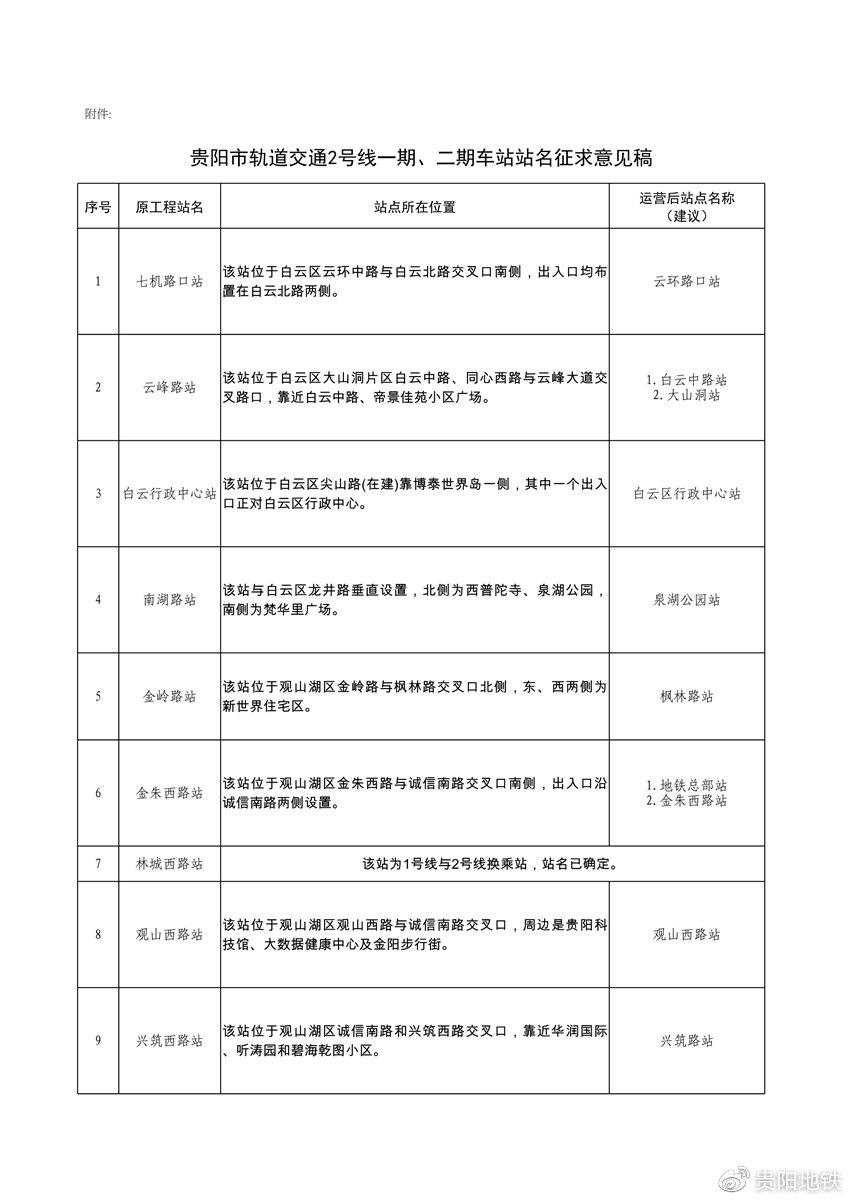 附件:贵阳市轨道交通2号线一期、二期车站站名征求意见稿