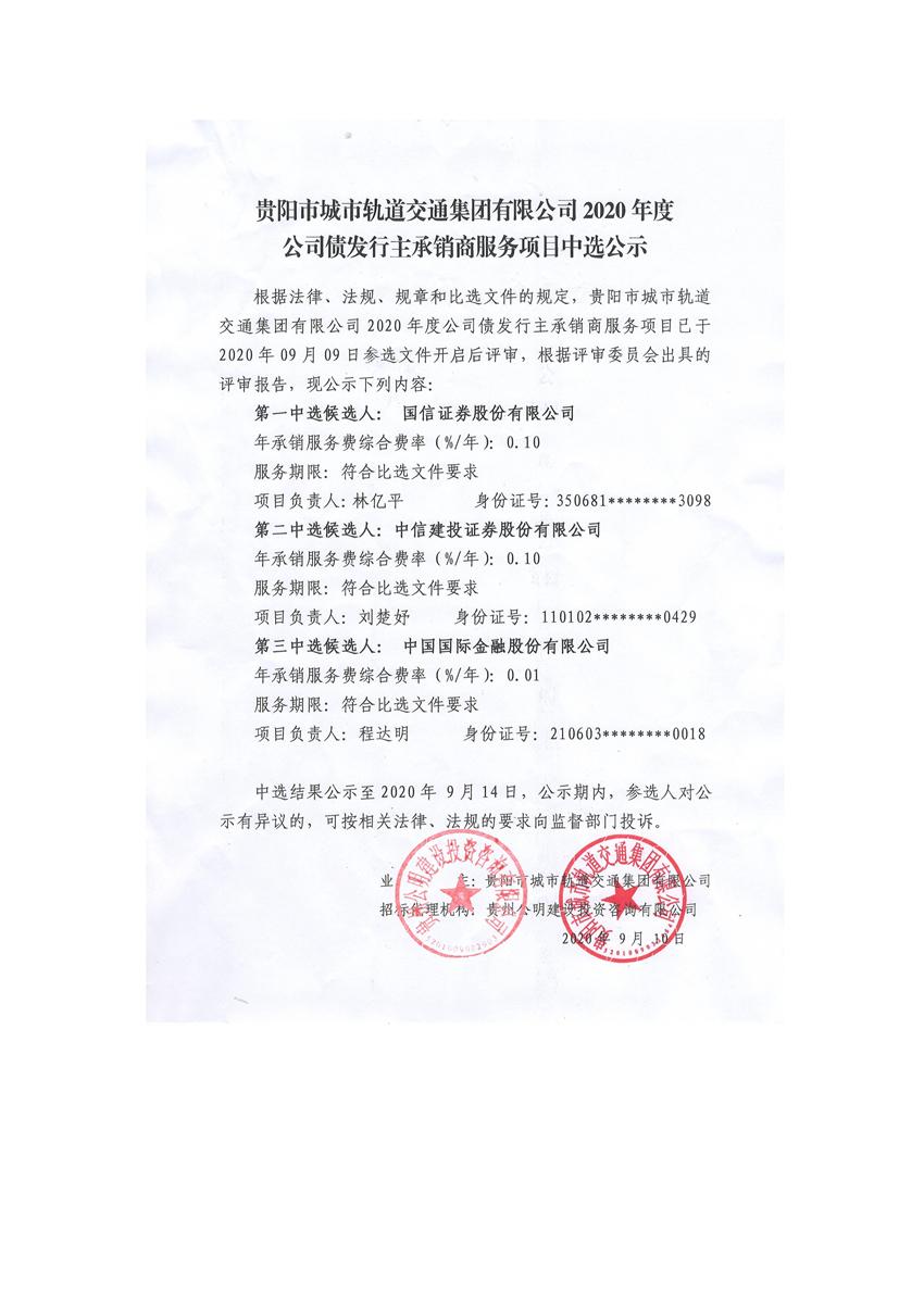贵阳市城市轨道交通集团有限公司2020年度公司债发行主承销商服务项目中选公示