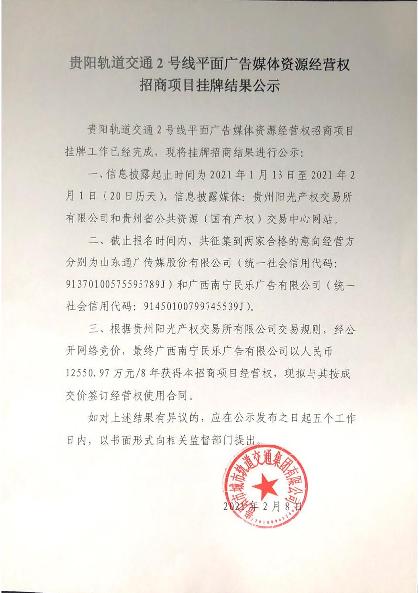 贵阳轨道交通2号线平面广告媒体资源经营权招商项目挂牌结果公示