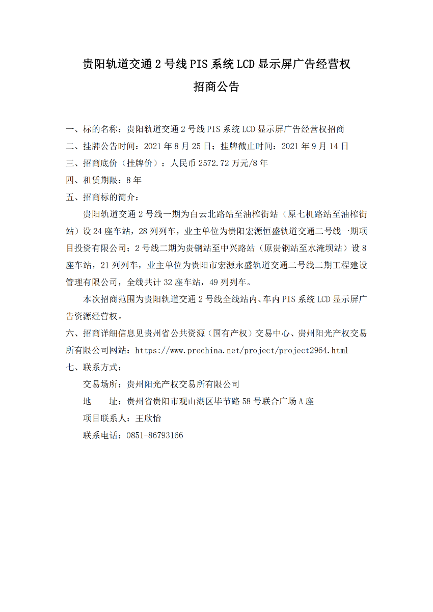 贵阳轨道交通2号线PIS系统LCD显示屏广告经营权招商公告