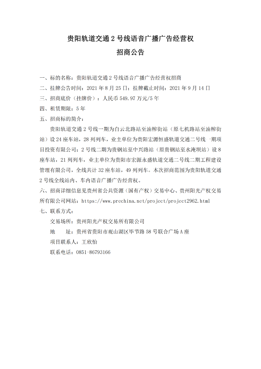 贵阳轨道交通2号线语音广播广告经营权招商公告
