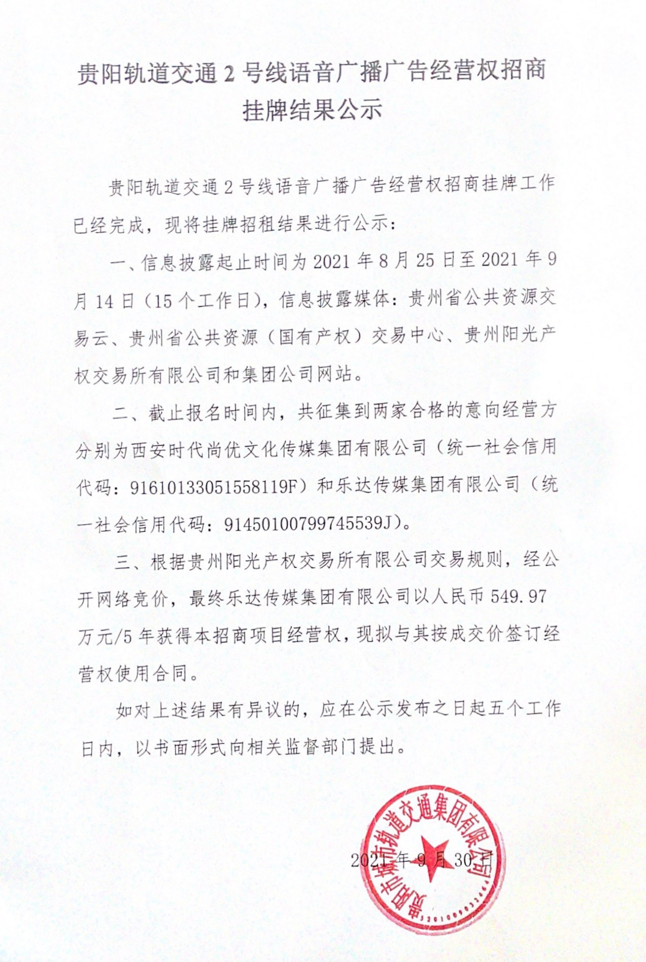 贵阳轨道交通2号线语音广播广告经营权招商挂牌结果公示