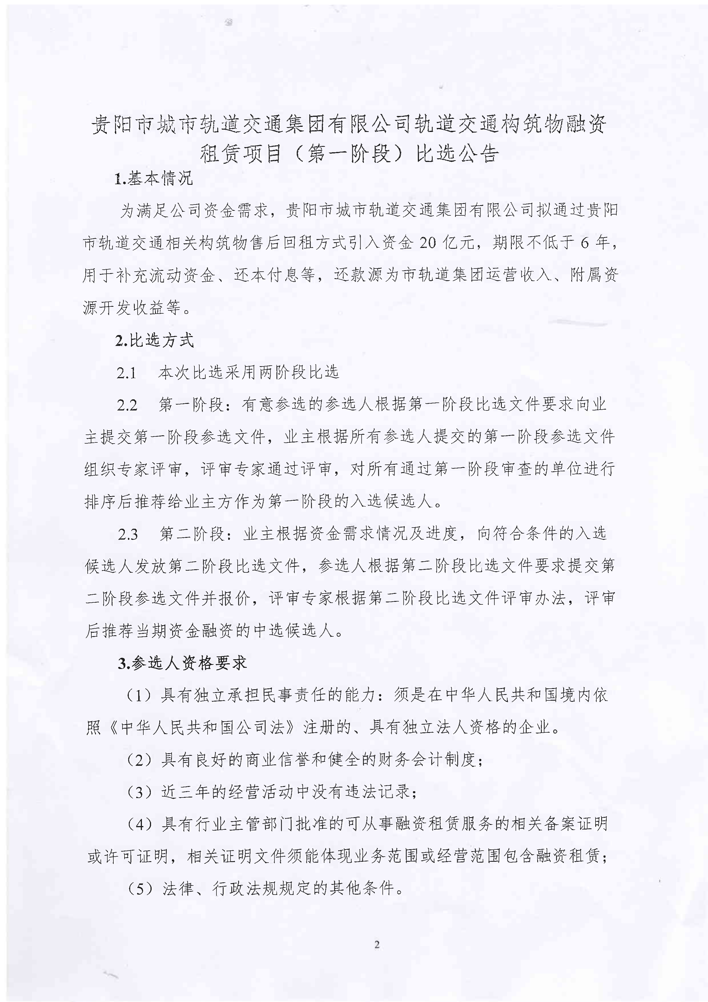 贵阳市城市轨道交通集团有限公司轨道交通构筑物融资租赁项目(第一阶段)比选公告