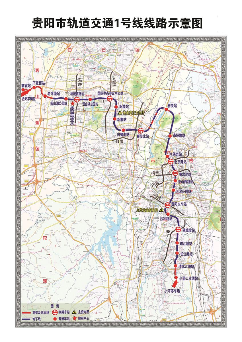 1号线全长35.11公里,起于观山湖区窦官,经云岩区和南明区,止于经开区场坝村,共有25座车站、24个区间、1个车辆段、1个停车场、2座主变电所和1个运营控制中心(OCC)。