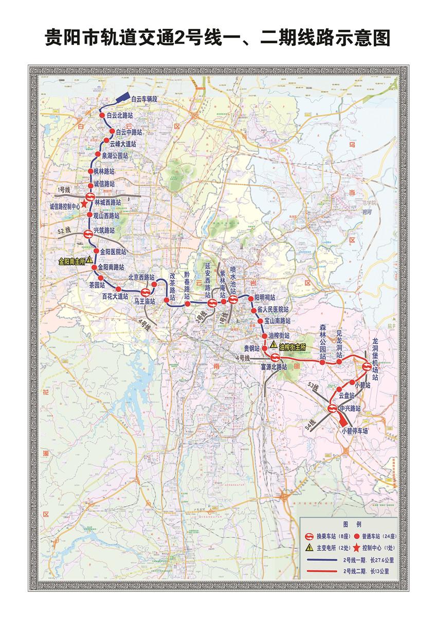 轨道交通2号线(一期、二期)全长40.6公里(其中,2号线一期27.6公里、二期13公里),从北至南串联白云区、观山湖区、云岩区、南明区及双龙区,包括32个车站(其中,2号线一期24个、二期8个)、1个车辆段、1个停车场,2座主变电所和1个运营控制中心(与1号线共用)。