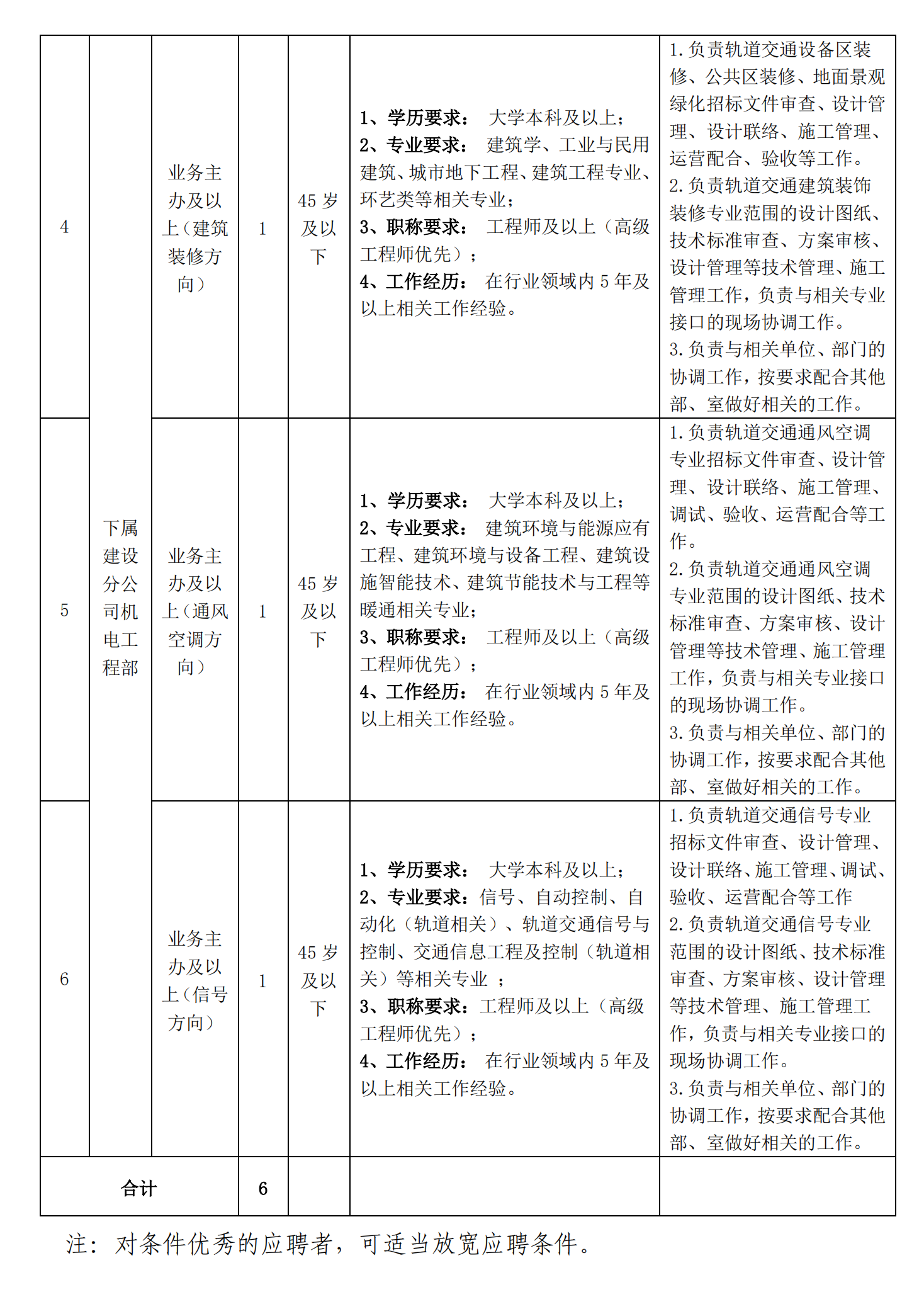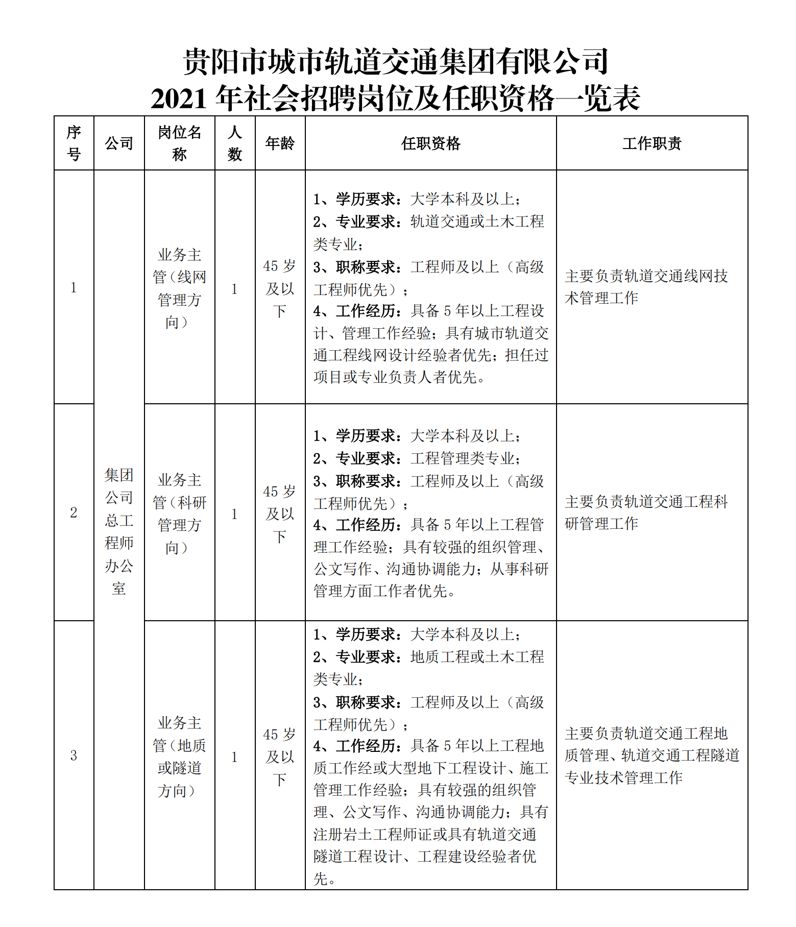 根据贵阳市轨道交通建设及实际工作需要,集团公司总工程师办公室和下属建设分公司亟需引进专业技术人员。为此,特面向社会公开招聘6名轨道交通相关专业技术人员,现将相关信息公布如下: