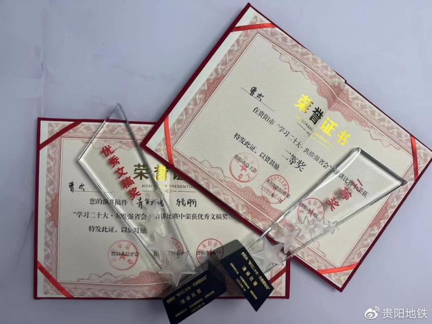 比赛当天,曹欢以“青年扬帆 与党同行”为题,以学习贯彻落实党的二十大报告为重点,结合习近平总书记视察贵州重要讲话精神,从贵阳地铁的规划、建设与运营管理等方面,通过生动的演讲,多角度、深层次、全方位展示了贵阳交运人的使命和担当。演讲内容及现场表现获得了观众和评委老师的肯定,最终荣获贵阳市“学习二十大·共推强省会”演讲比赛二等奖及优秀文稿奖。